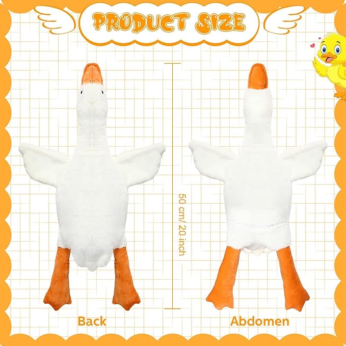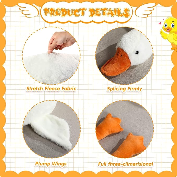 Large 120cm Size: Huggable large plush toy perfect for kids to cuddle, sleep on or use as decoration.Kawaii Inspired Design: Adorable white goose design with soft and fluffy fur, attractive to kids and animal lovers.Soft and Skin-Friendly Material: Made of high-quality plush fabric that is safe, soft and gentle for kids.Perfect Sleeping Pillow: Can be used as a comfortable pillow, providing comfort for naps, bedtime or relaxing.Perfect Birthday Gift: Great for birthdays, holidays or as a surprise gift, bring joy to kids and plush collectors.